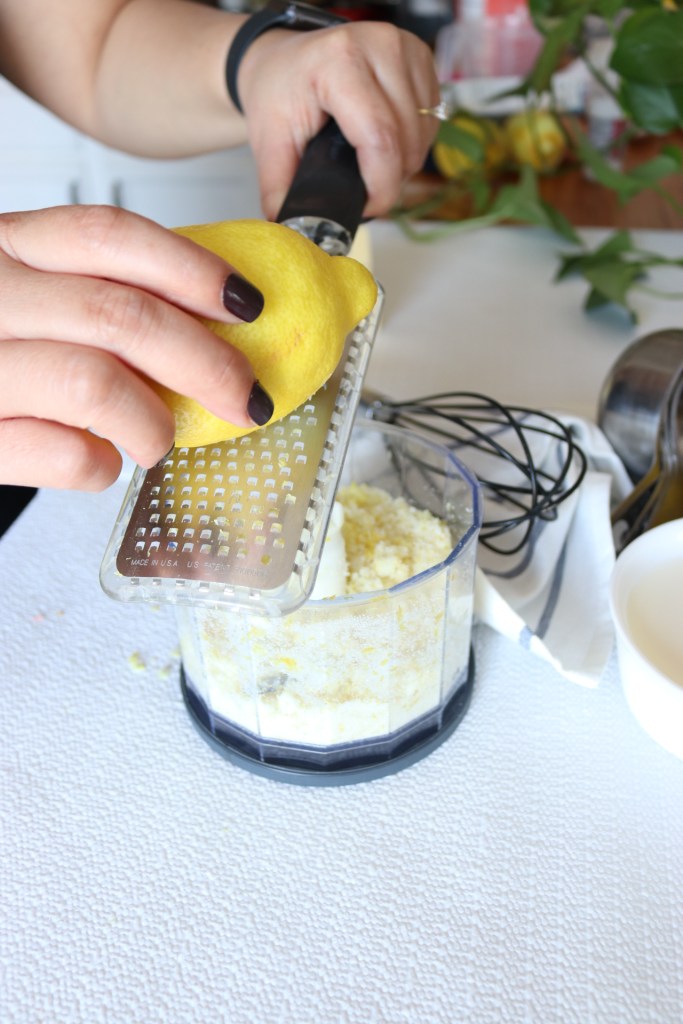 - Preheat oven at 375F. While the oven is preheating, add sugar and lemon zest to a food processor & pulse until the sugar turns into a light yellow color & the zest has been broken up.