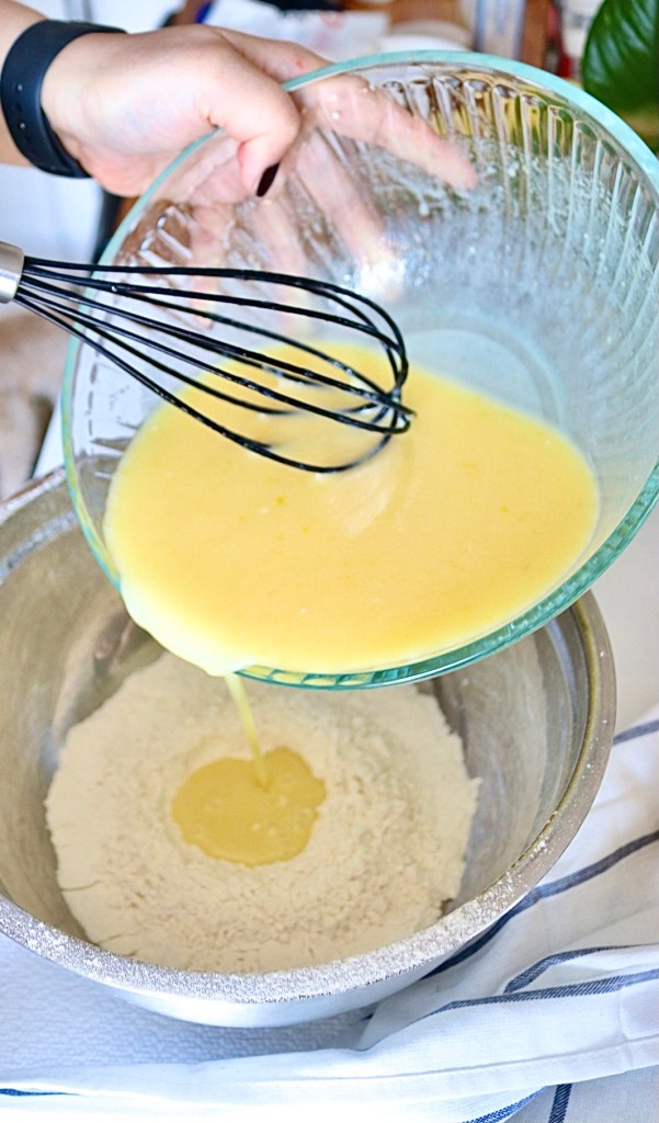 - In a medium bowl add sour cream, melted butter, eggs, milk sugar, lemon juice. Whisk together then set aside.