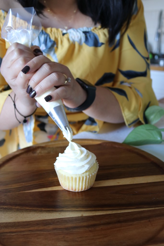 - Let the cupcakes cool down. Once its cool you can start decorating. Start piping a circle of buttercream on top. Then top with lemon zest.