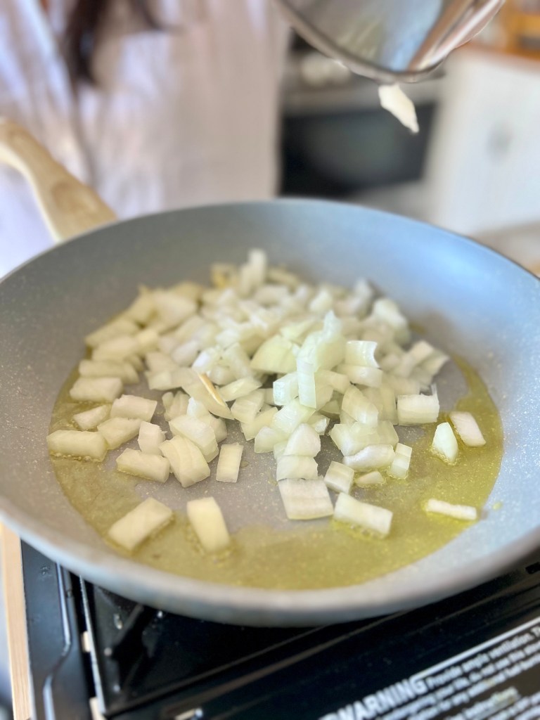 1. Begin by heating a skillet over medium heat, then add the olive oil and onions. Sauté the onions and carrots until they become tender.