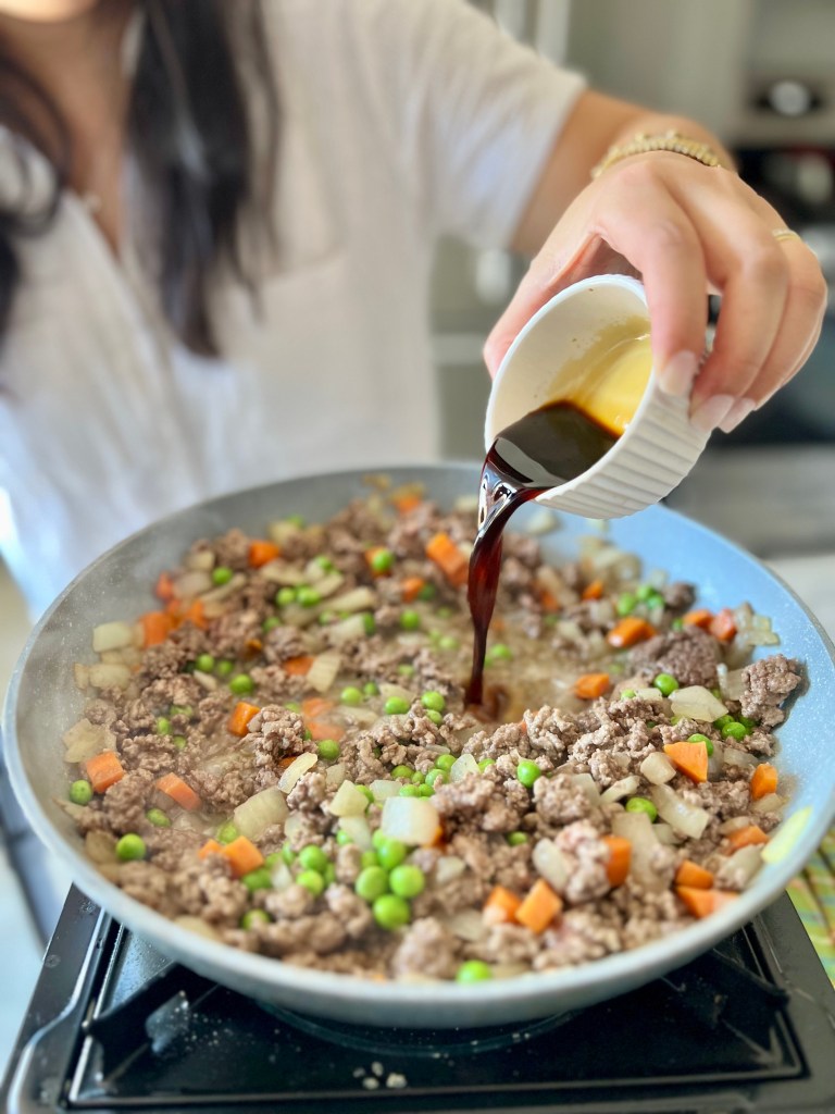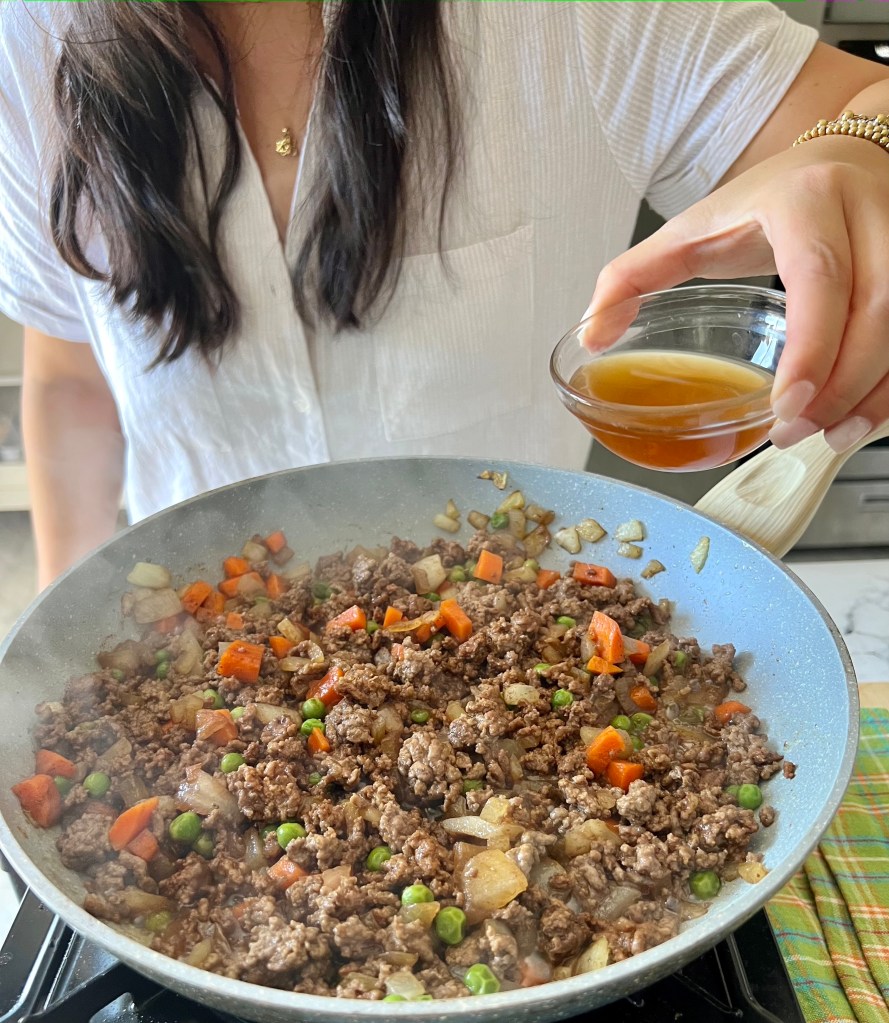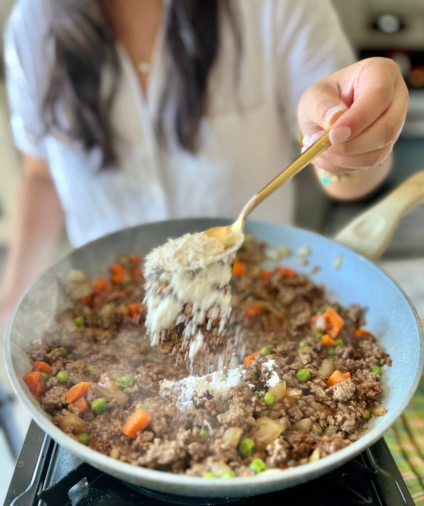 2. Next, add the 1 lb of Laura’s Lean Ground Beef to the skillet, along with the salt and pepper. Cook until the beef is browned and fully cooked. Then, add the peas and coconut aminos, allowing them to simmer together. Finally, sprinkle the flour over the mixture to create a thick, savory base.